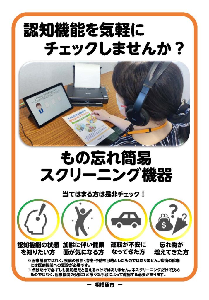 スクリーニング機器を使用したい方は、お住いの地区の地域包括支援センターへご連絡してください。費用はかかりません。