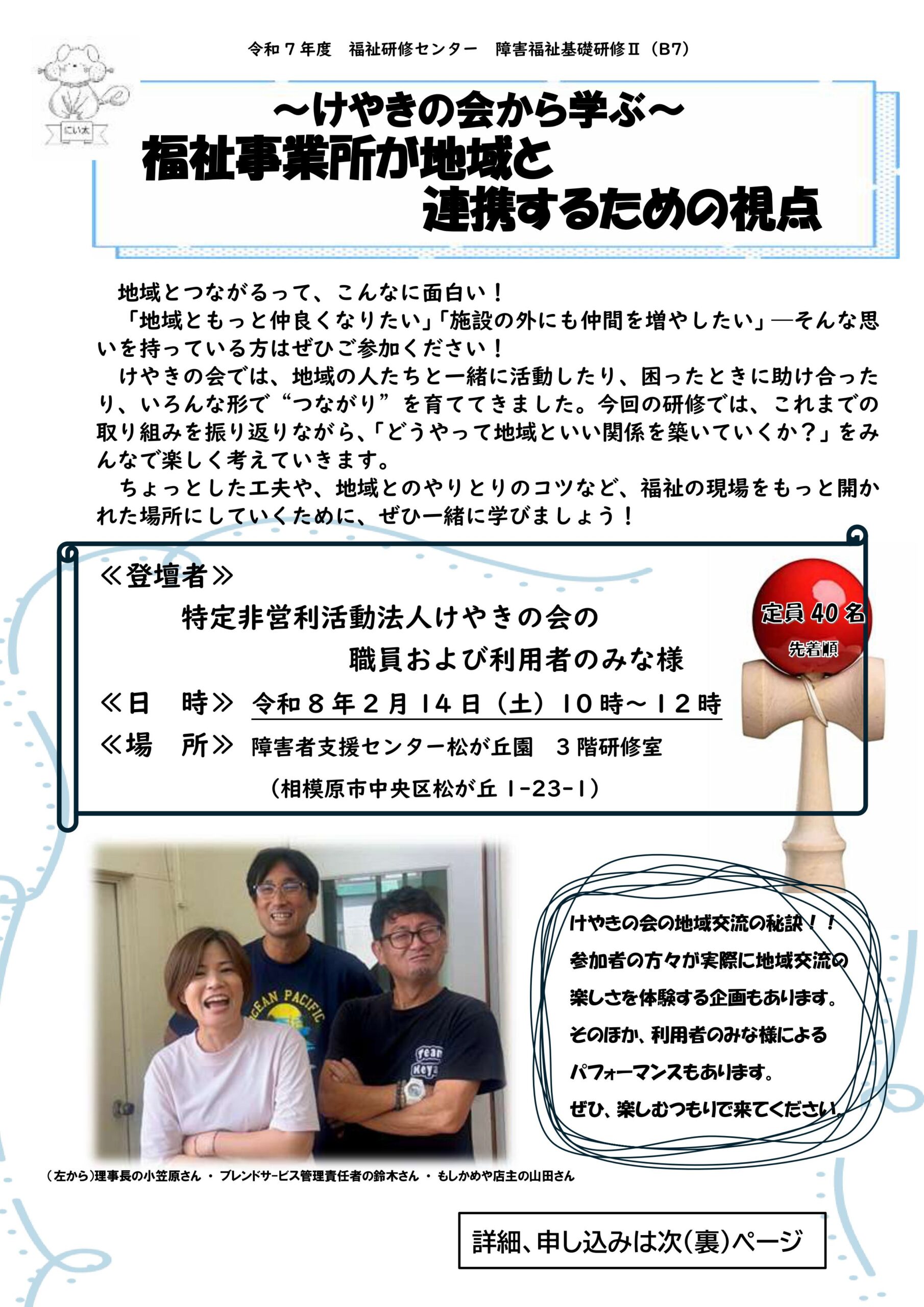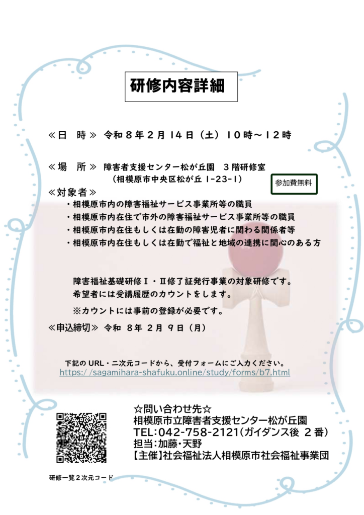 相模原市社会福祉事業団主催の研修があります。なんとけやきの会が講師を勤めます。